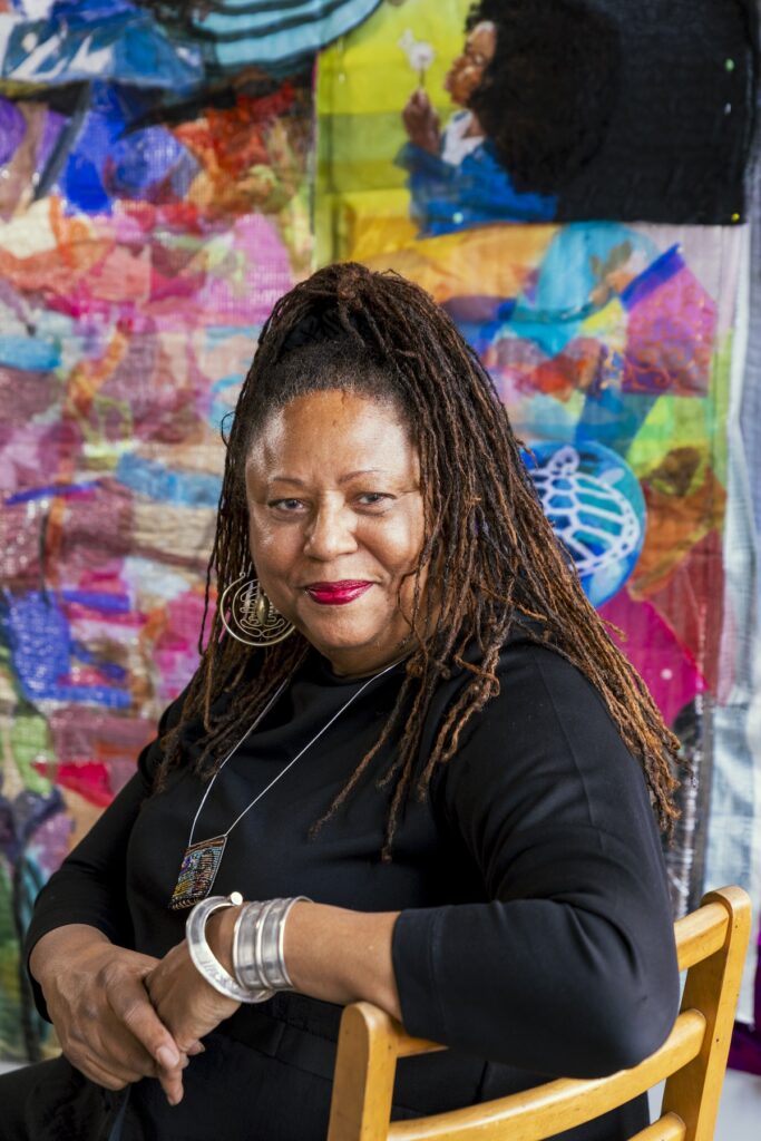 L’Merchie Frazier is an international multimedia visual activist, public artist, and historian. She uses innovative visual media, poetry, and textile language as design elements to create restorative narratives highlighting five hundred years of Black and Indigenous experience. Her visual art stories are carefully researched and joyously create textile integrations for reclaiming the lives and legacies of history’s missing people. Her work marshals archival materials as literal threads linking historical petitions, speeches, letters, lawsuits, newspaper clippings and photographs.
