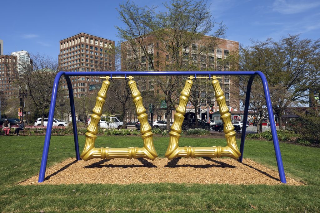 Big Hoops to Fill is a large-scale sculpture designed by Boston-based artist, sculptor, and jewelry maker Ja’Hari Ortega (she/her). The artwork features two outsized golden bamboo hoop earrings –also known as “door knocker earrings” – that function as interactive swings. Cast from fiberglass with steel interior supports, the earrings hang from a swing set frame that echoes the one the artist grew up playing on in Roxbury, MA.
