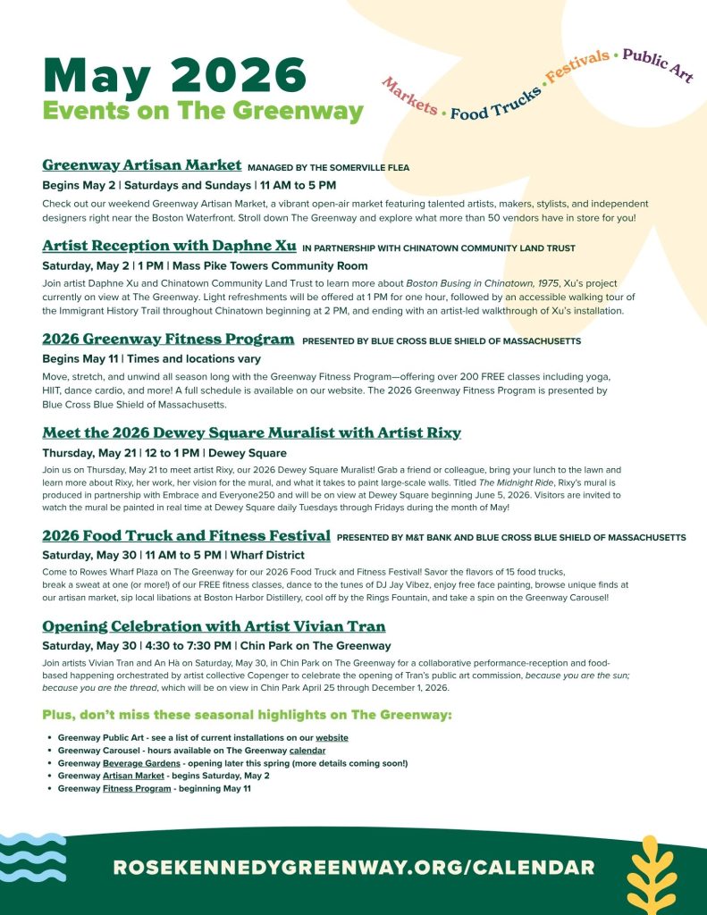 If you’re looking for family-friendly fun in Boston this month, we hope you’ll visit The Greenway! You can also download a PDF version of our Monthly Roundup to print or share with friends, family, or your next adventure crew.