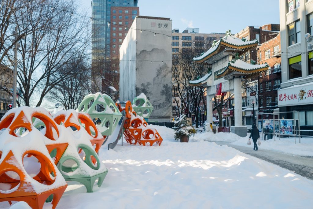No matter the weather, The Greenway offers visitors countless opportunities to explore and engage with Public Art, and this winter is no exception. In Chinatown, Misa Chhan’s Year of the Snake is on display, encouraging visitors to reflect on the themes of legacy and resilience of Cambodian diasporic communities, as well as a series of flags featuring the Chinese character fu, meaning ‘blessing’ and ‘luck’. Chaan’s installations are on display through the end of January 2026.
